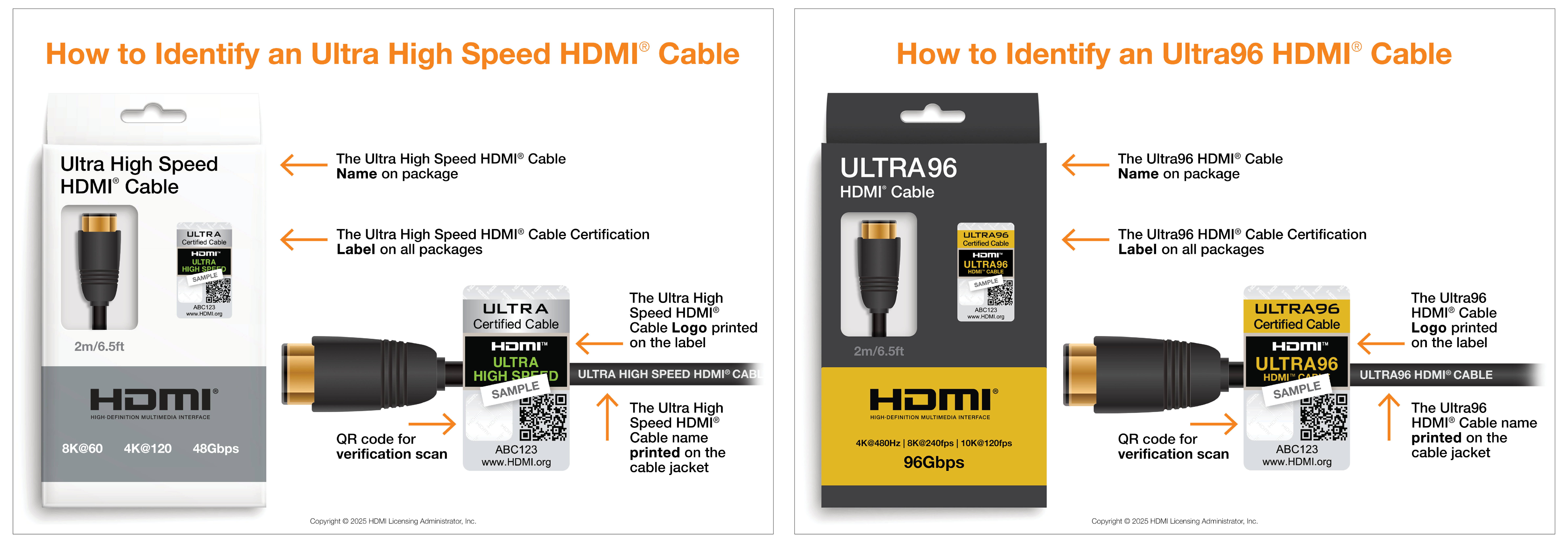 - 新的 Ultra96 HDMI 线缆支持高达 96Gbps 的带宽,是唯一支持所有 HDMI 2.2 规范应用的线缆。它具有极低的电磁干扰(EMI)辐射,可与现有 HDMI 设备配合使用,并且是官方超高速线缆认证计划的一部分 更多信息请参考详细页面链接