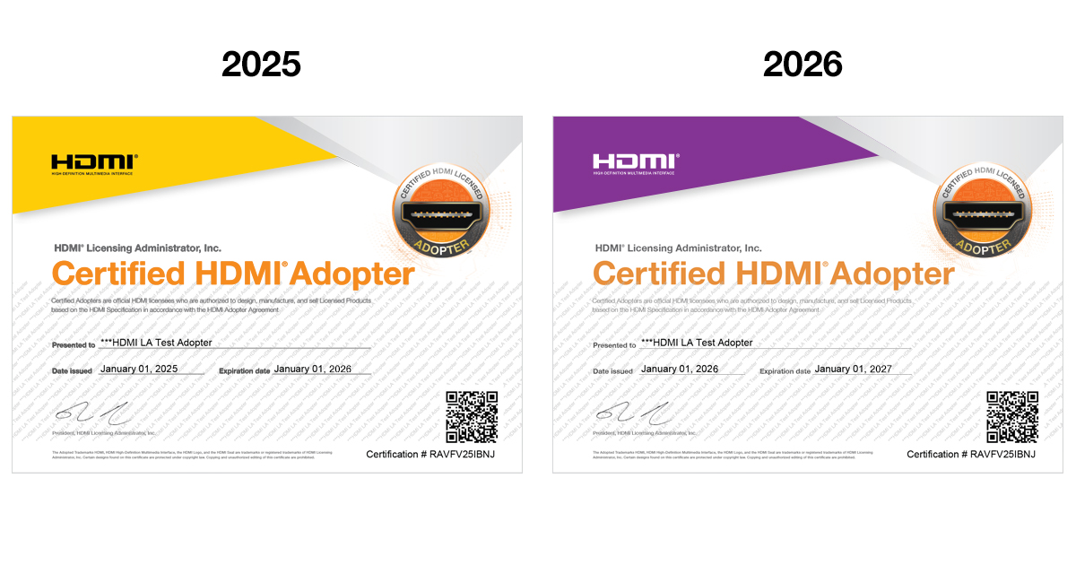 Each year, HDMI LA releases a different HDMI® Adopter Certificate with enhanced anti-counterfeiting features. Adopter Certificates are issued on request and will be provided to Adopters that are Compliant. The certificate is valid for one year from the Adopters license anniversary date. Adopter Certificates can be provided to Resellers/Brands and Customs Authorities to show the manufacturer is licensed and in good standing.
